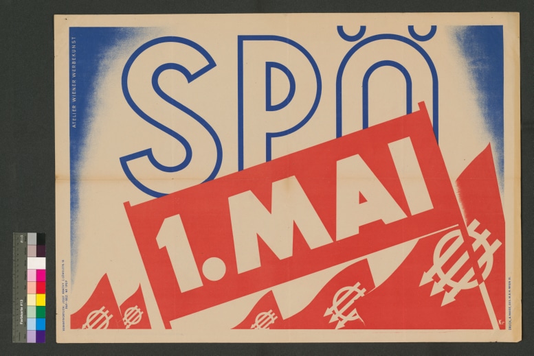 Text:"SPÖ 1. Mai"Bild: Rote Fahnen mit SPÖ-Logo, auf der größten Fahne steht:"1. Mai", darüber steht:"SPÖ"Schrift: blau und weiß. Bild: Blau, weiß, rot.(2 Expl.)