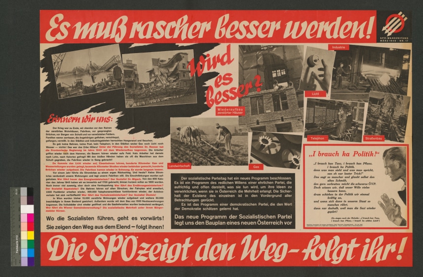 SPÖ Wandzeitung Nr. 17, März 1948Es muss rascher besser werden! Wird es besser?Erinnern wir uns: ...Wo die Sozialisten führen, geht es vorwärts! Sie zeigen den Weg aus dem Elend - folgt ihnen!Bilder zu ...