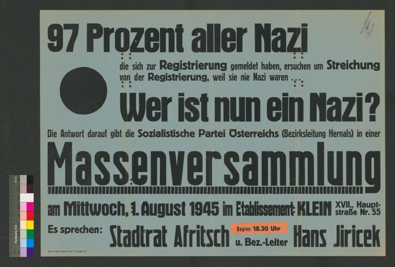 Text:"97 Prozent aller Nazi die sich zur Registrierung gemeldet haben, ersuchen um Streichung von der Registrierung, weil sie nie Nazi waren... Wer ist nun ein Nazi?Die Antwort darauf gibt die Sozialistische Partei Österreich...
