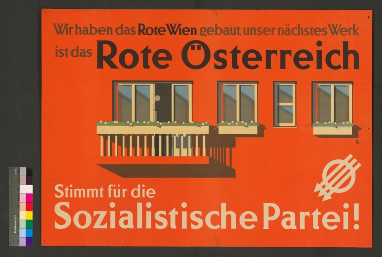 Text:"Wir haben das Rote Wien gebaut, unser nächstes Werk ist das Rote Österreich / Stimmt für die Sozialistische Partei!" Bild: Rote Hausfassade mit Fenstern und Balkon. SPÖ-Logo.Schrift: grau, schwarz, weiß. Bil...