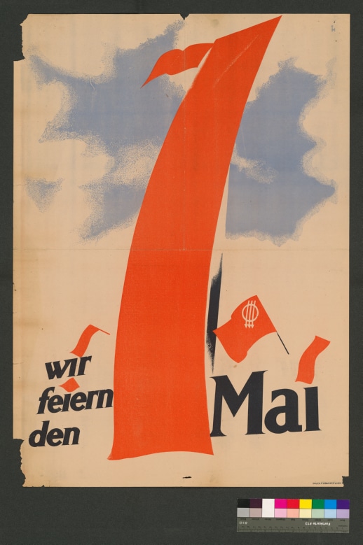 Text:"wir feiern den 1. Mai"Bild: Rote Eins ragt in den blauen Himmel. Kleine rote Fahne mit SPÖ-Logo. Die i-Punkte sind ebenfalls als rote Fahnen gestaltet.Schrift: schwarz, rot. Bild: blau, rot.