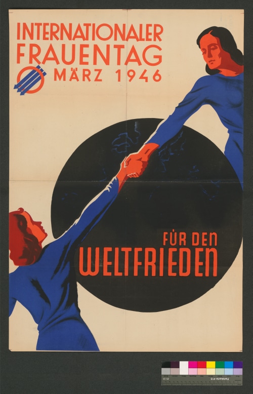 Text:"Internat. sozialistischer Frauentag 1948 Frauen zweier Weltkriegekämpft für den Weltfrieden!"Bild: Alte Frau, junge Frau und Mädchen stehen hintereinander. Die alte Frau hat ihre Arme um die Schultern der bei...