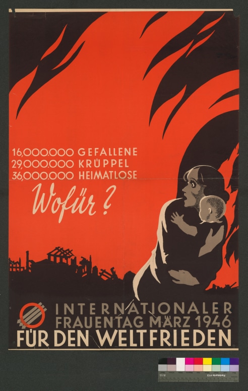 Text:"16,000.000 Gefallene / 29,000.000 Krüppel / 36,000.000 Heimatlose / Wofür? / Internationaler / Frauentag März 1946 / Für den Weltfrieden"Bild: Eine rote Flamme nimmt fast die gesamte Bildfläche ein. Brennende, zerst...