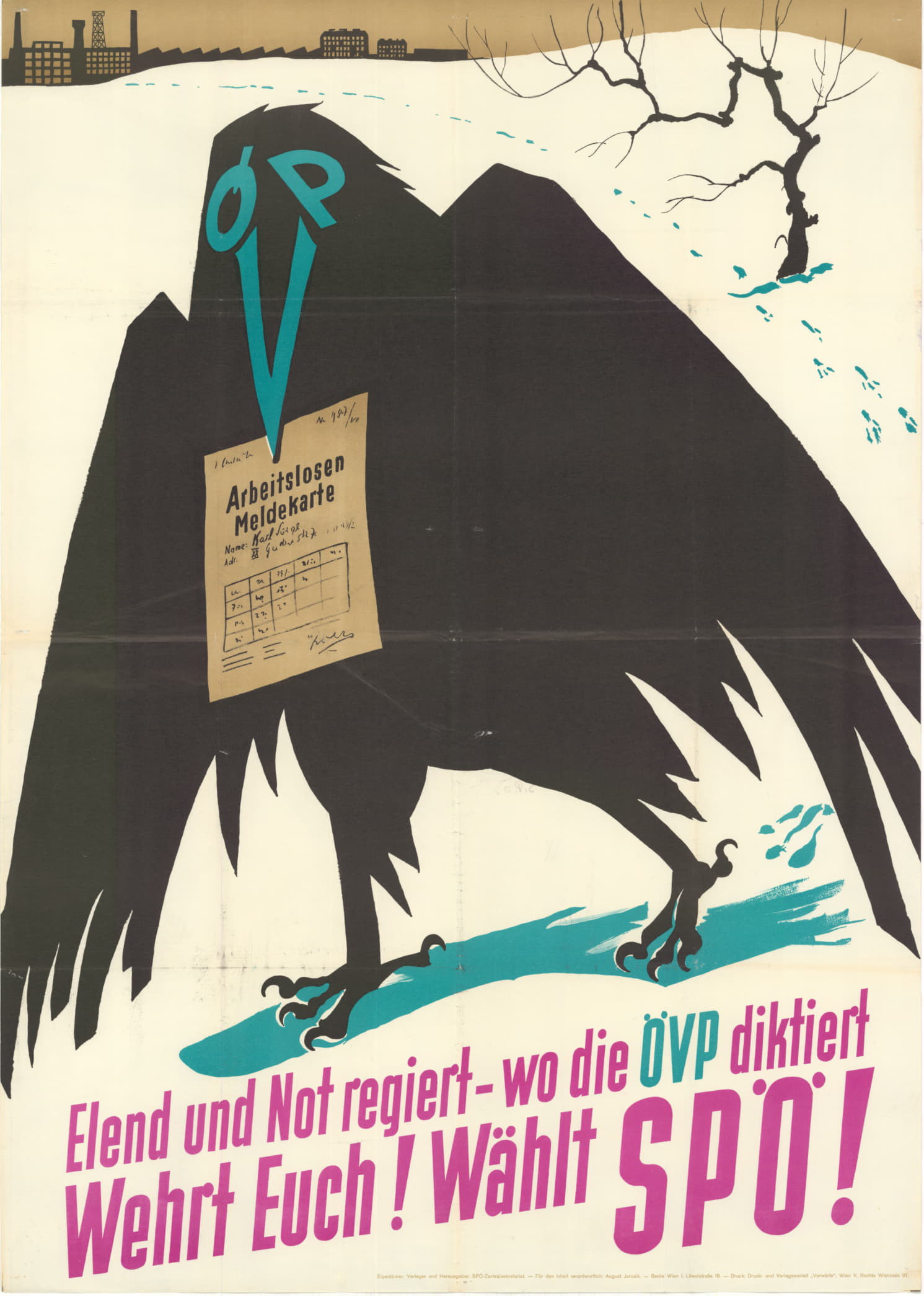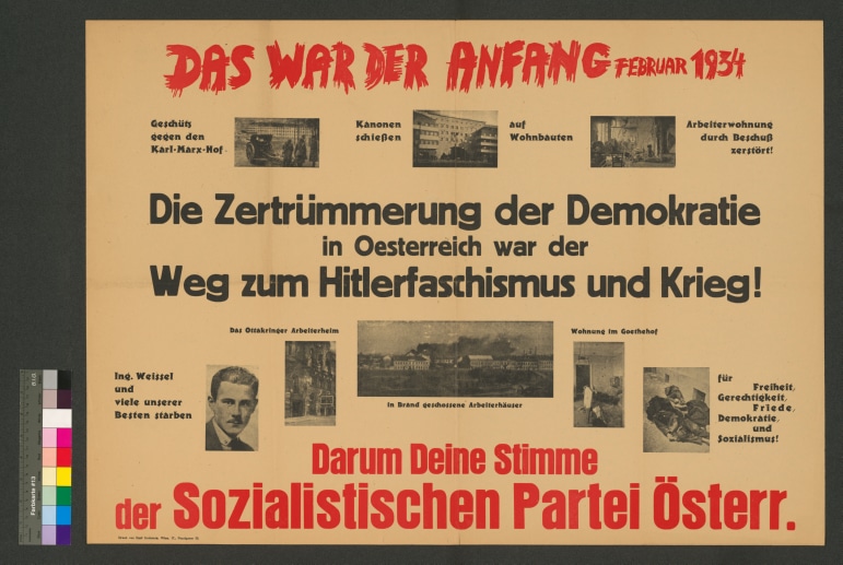 Text: "Das war der Anfang Februar 1934 / Geschütz gegen den Karl-Marx-Hof / Kanonen schießen / auf Wohnbauten / Arbeiterwohnung durch Beschuß zerstört! / Die Zertrümmerung der Demokratie in Oesterreich war der Weg zu Hitlerfa...