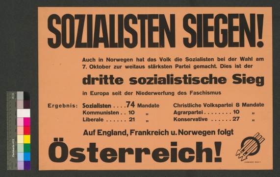 Text: "Sozialisten siegen!Auch in Norwegen hat das Volk die Sozialisten bei der Wahl am 7. Oktober zur weitaus stärksten Patrei gemacht. Dies ist der dritte sozialistische Sieg in Europa seit der Niederwerfung des Faschis...