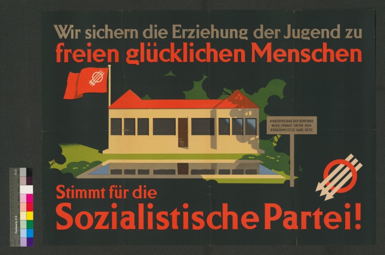 Text: "Wir sichern die Erziehung der Jugend zu freien glücklichen Menschen / Stimmt für die Sozialistische Partei!"Bild: Auf schwarzem Hintergrund zwischen Bäumen ein Gebäude mit Schwimmbecken, rote Fahne und Tafel mit...