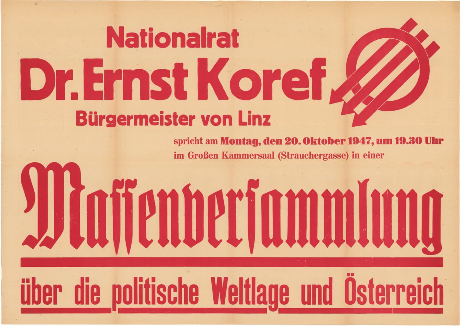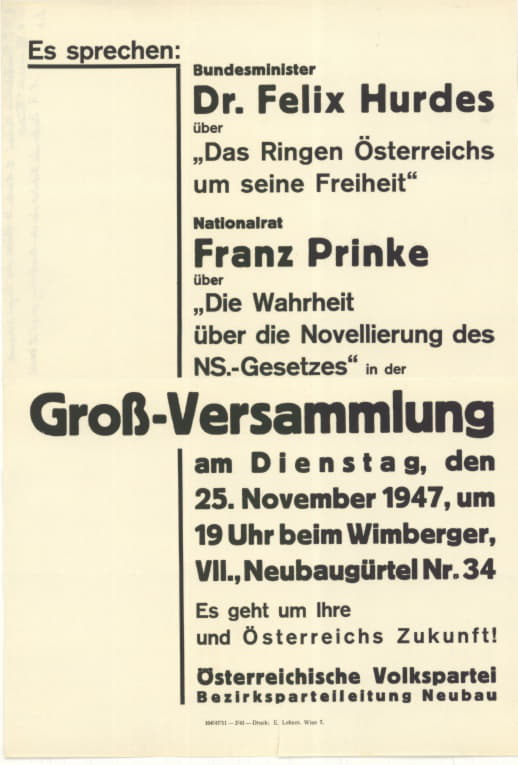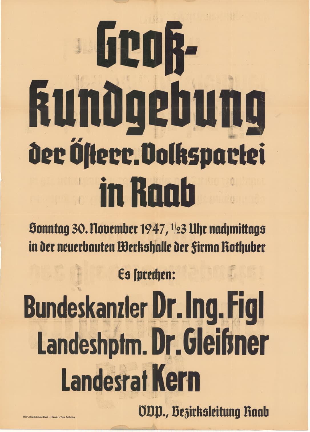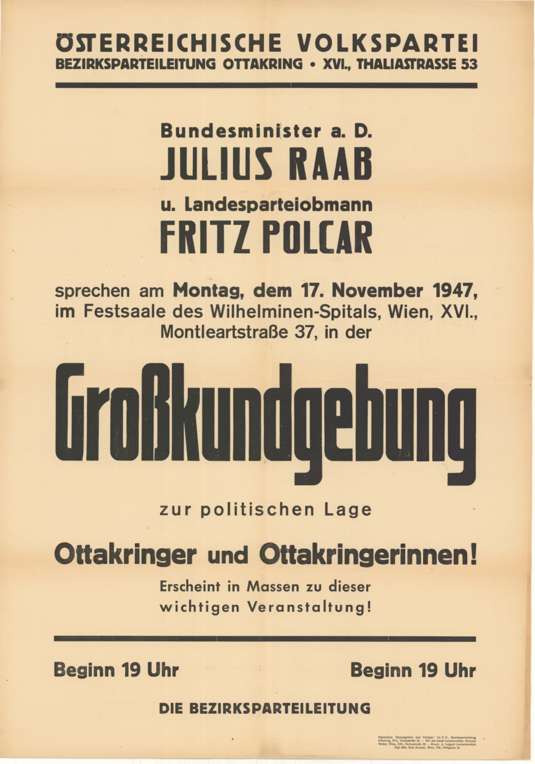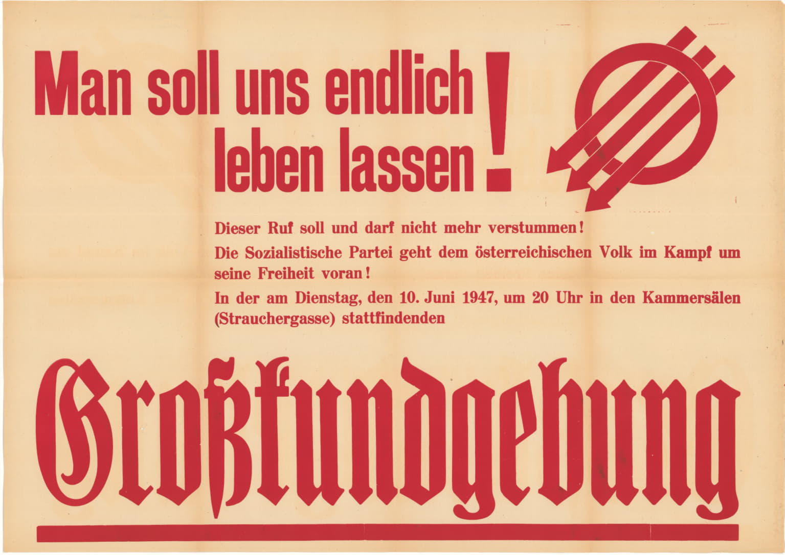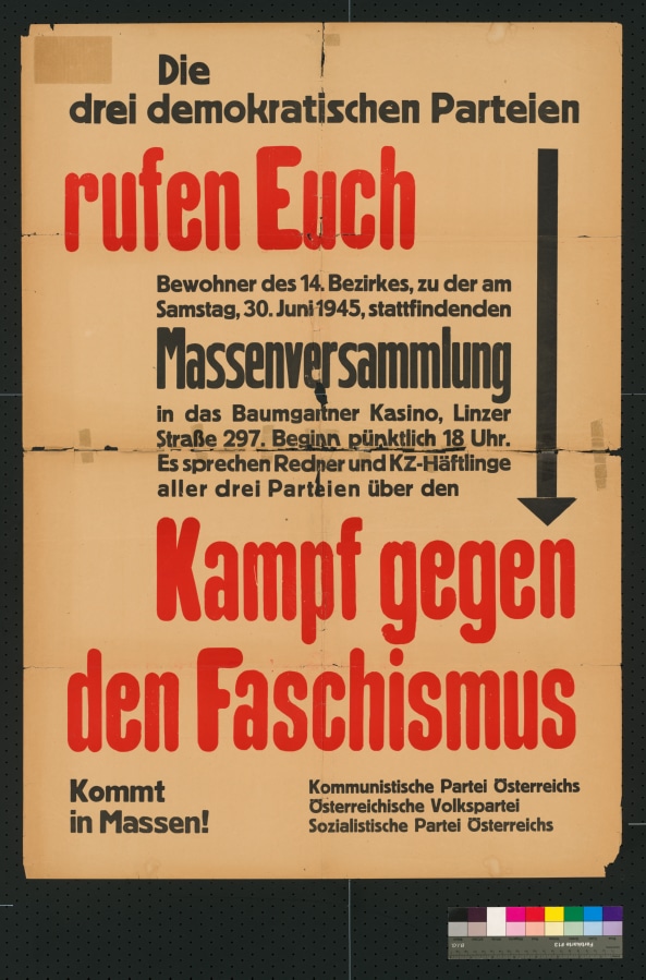 Text:"Die drei demokratischen Parteien rufen Euch Bewohner des 14.Bezirkes, zu der am Samstag, 30. Juni 1945, stattfindenden Massenversammlung in das Baumgartner Kino (...) Es sprechen Redner und KZ-Häftlinge aller drei Parteien ...