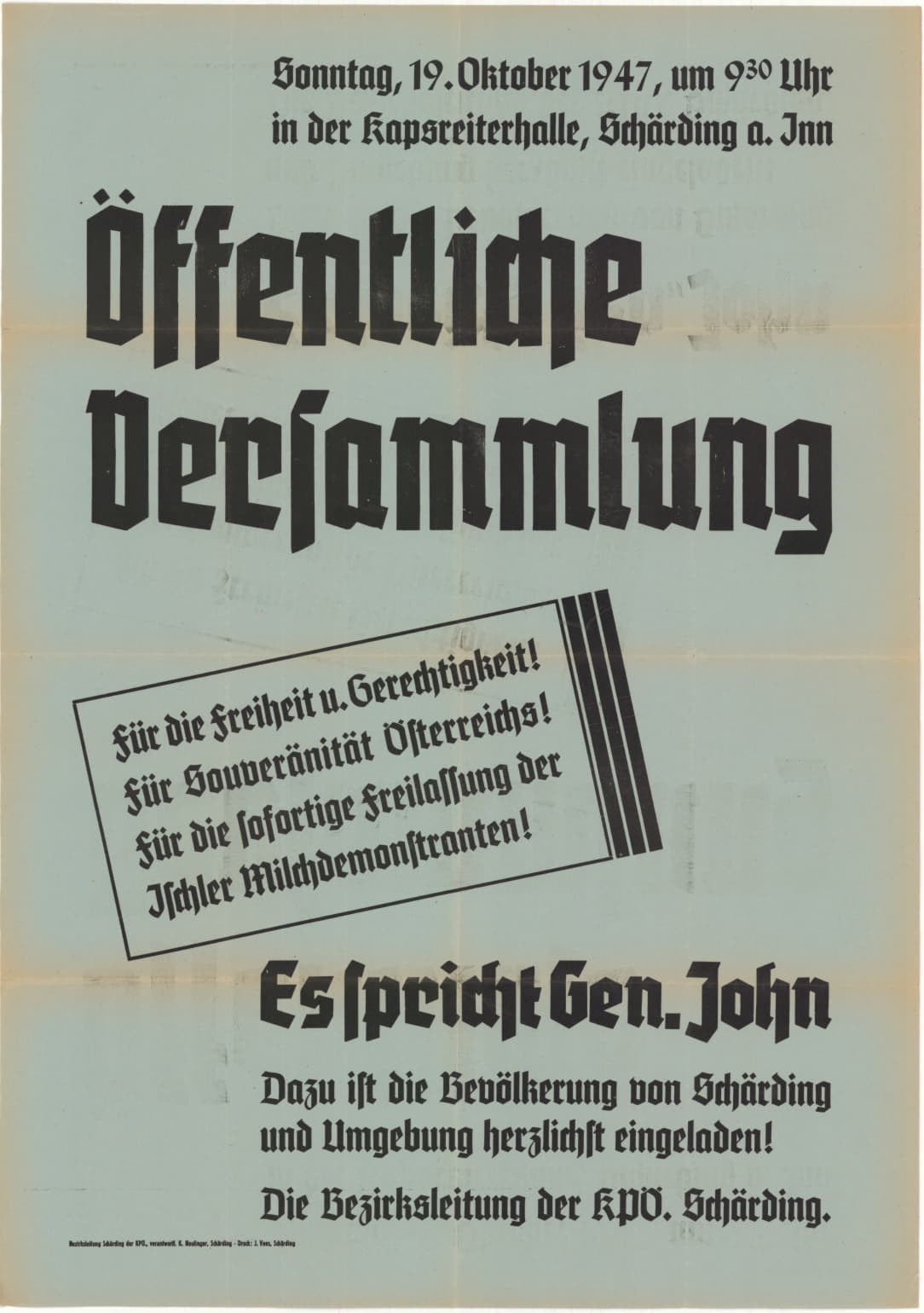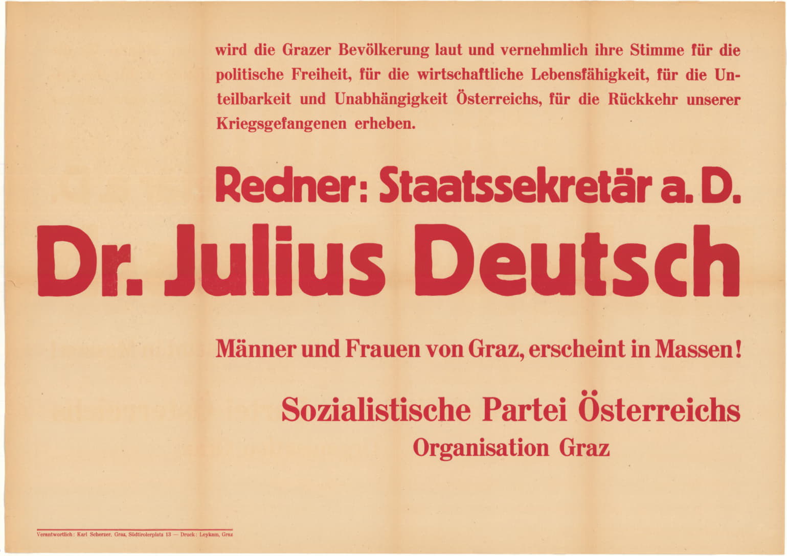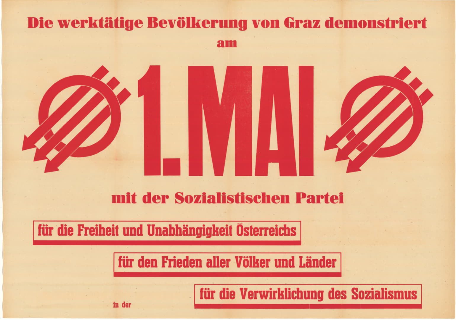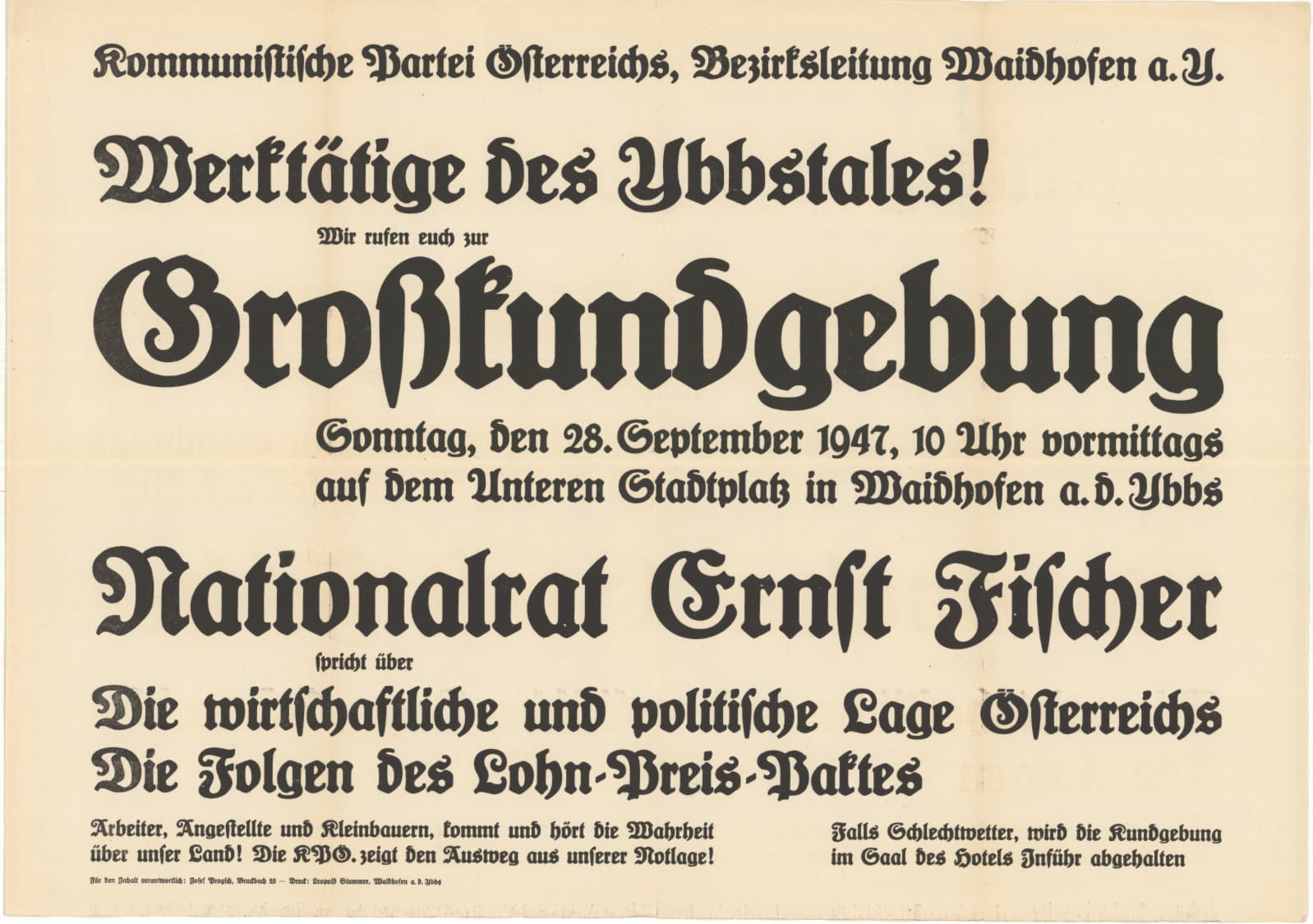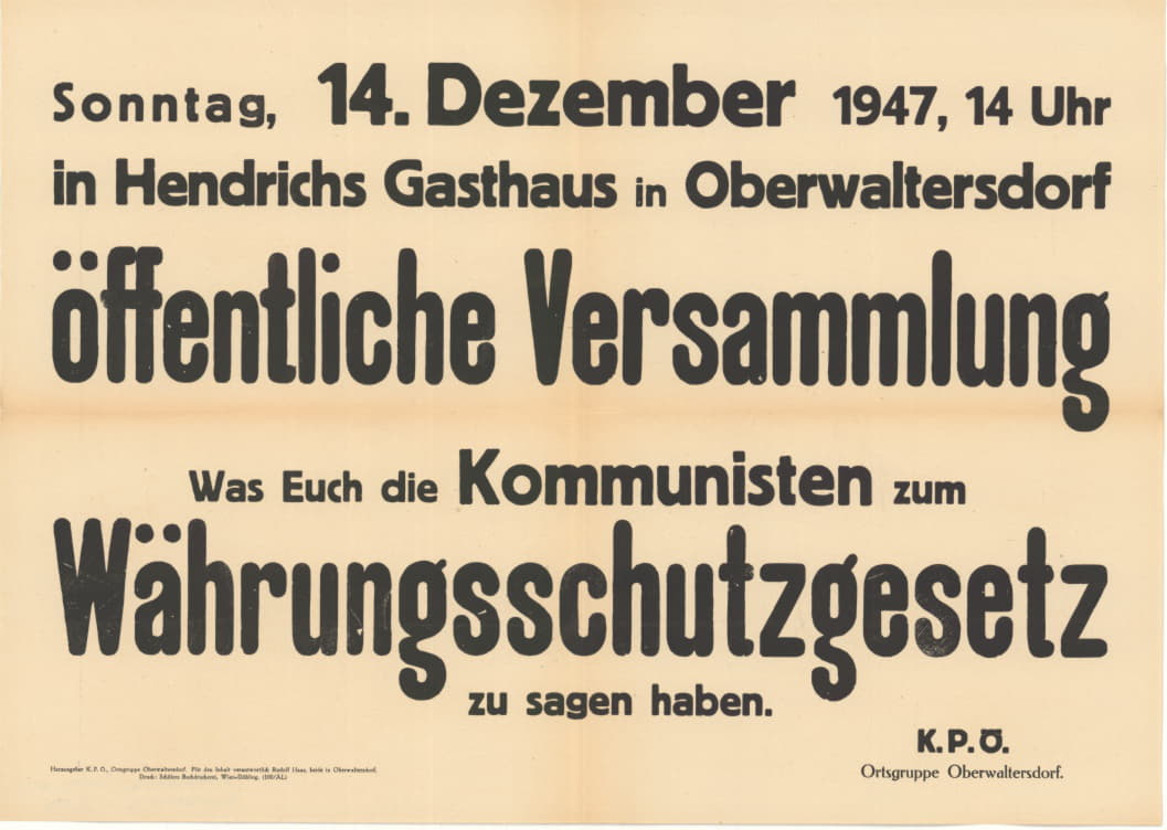 Text:"Die drei demokratischen Parteien rufen Euch Bewohner des 14.Bezirkes, zu der am Samstag, 30. Juni 1945, stattfindenden Massenversammlung in das Baumgartner Kino (...) Es sprechen Redner und KZ-Häftlinge aller drei Parteien ...