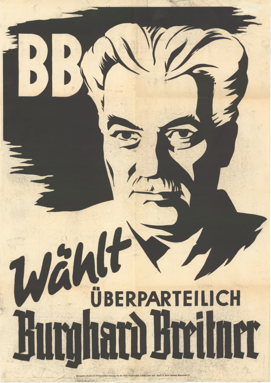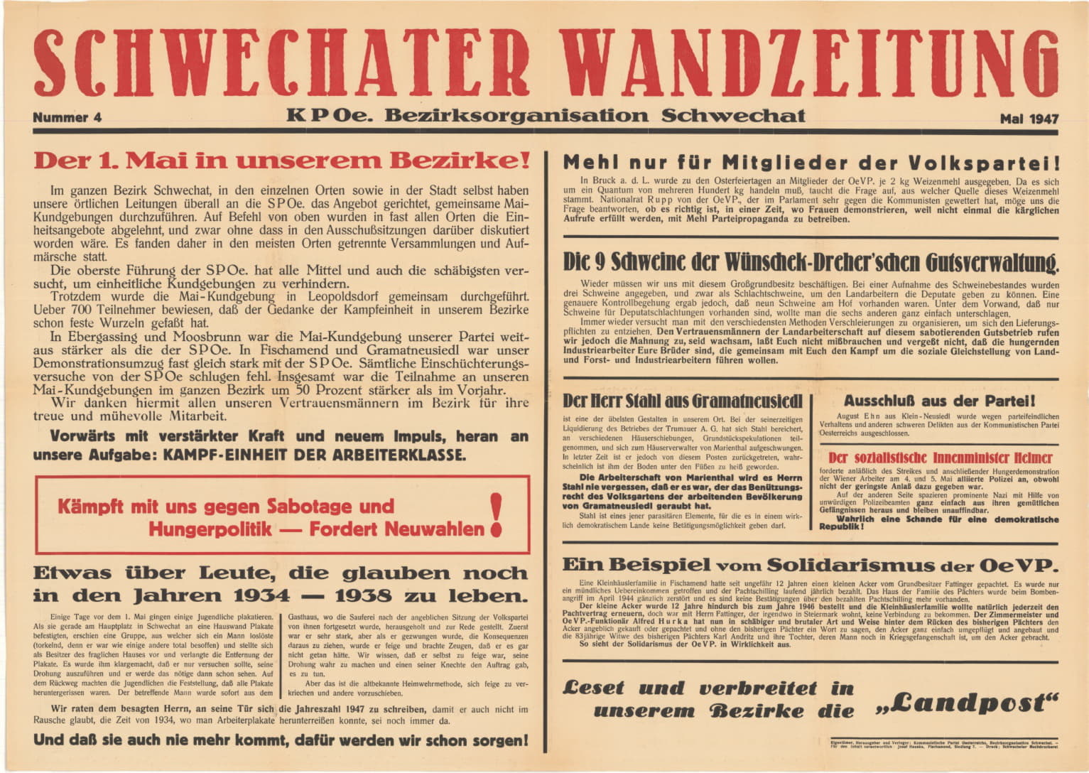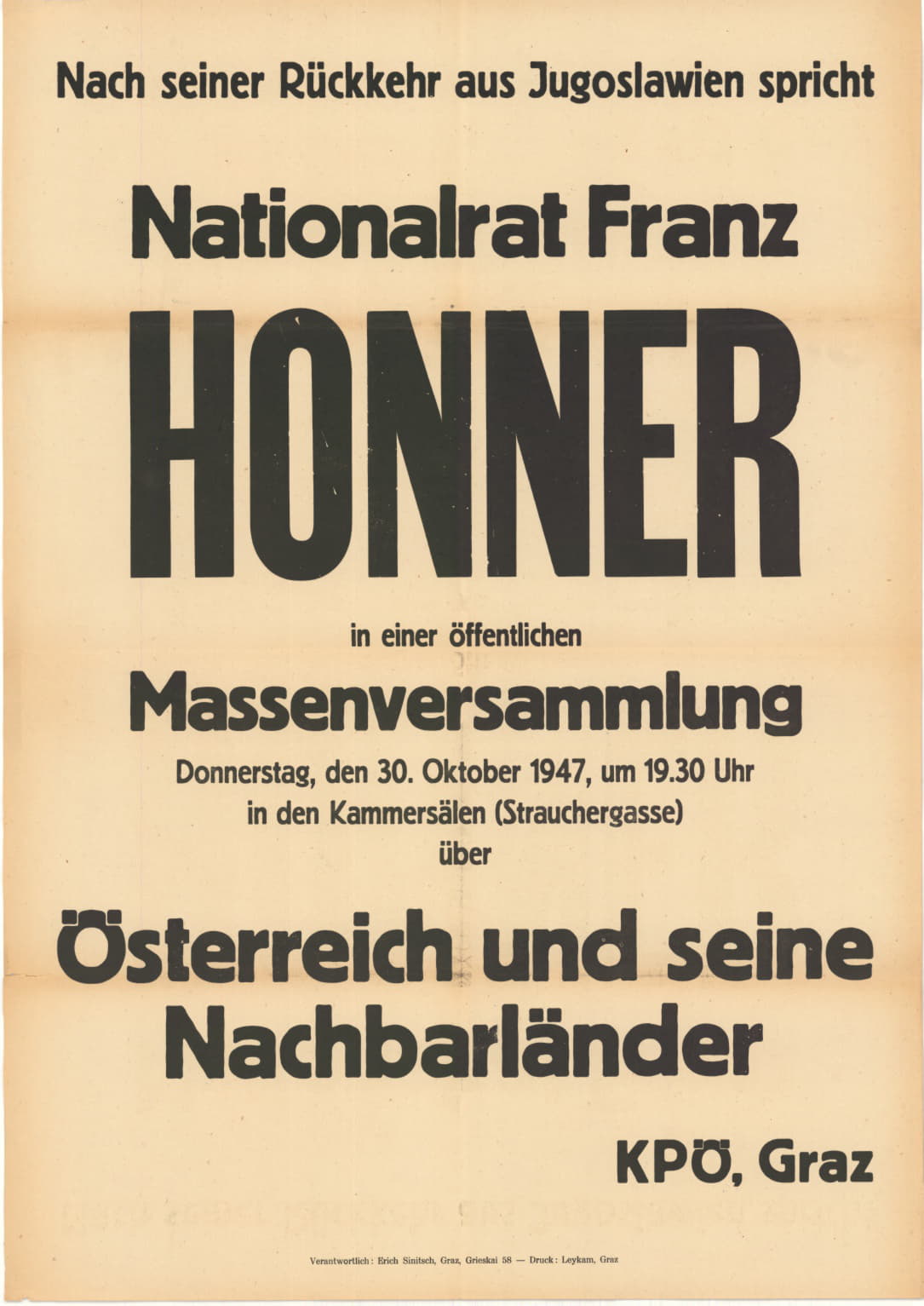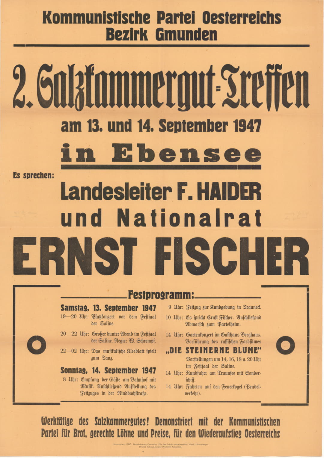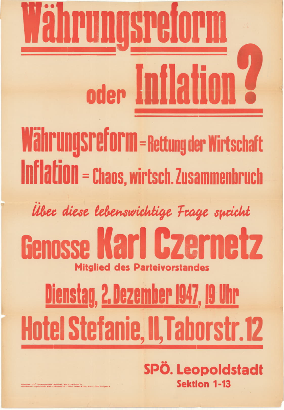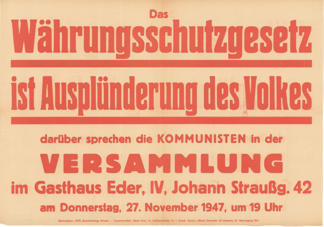 Text:"Die drei demokratischen Parteien rufen Euch Bewohner des 14.Bezirkes, zu der am Samstag, 30. Juni 1945, stattfindenden Massenversammlung in das Baumgartner Kino (...) Es sprechen Redner und KZ-Häftlinge aller drei Parteien ...