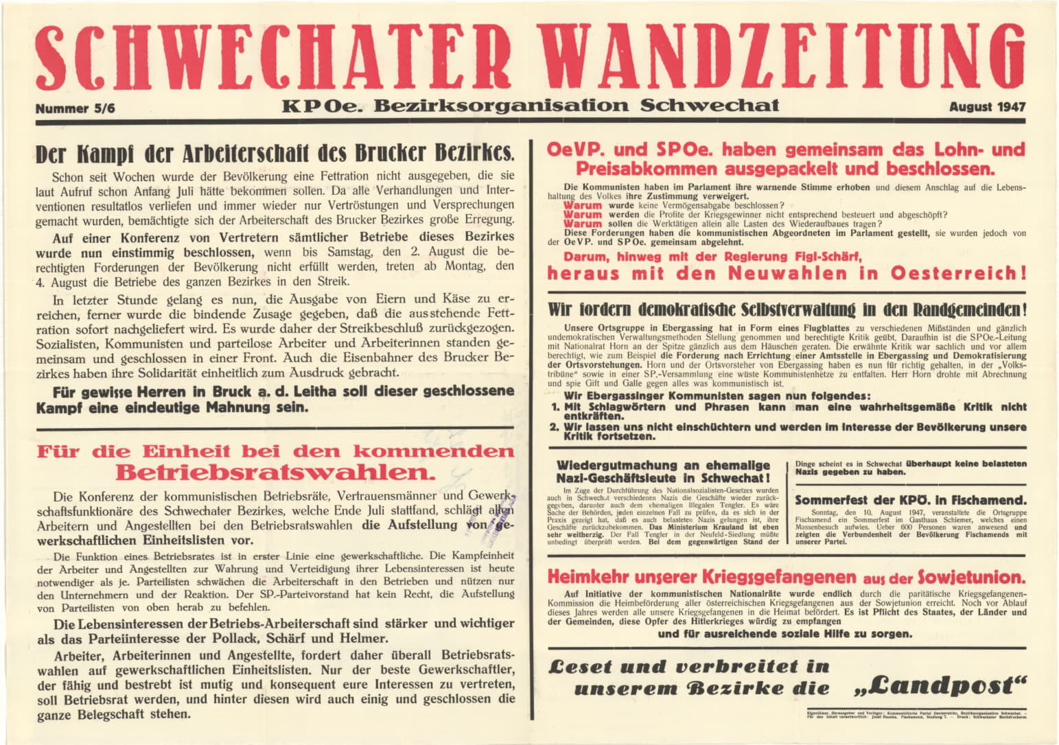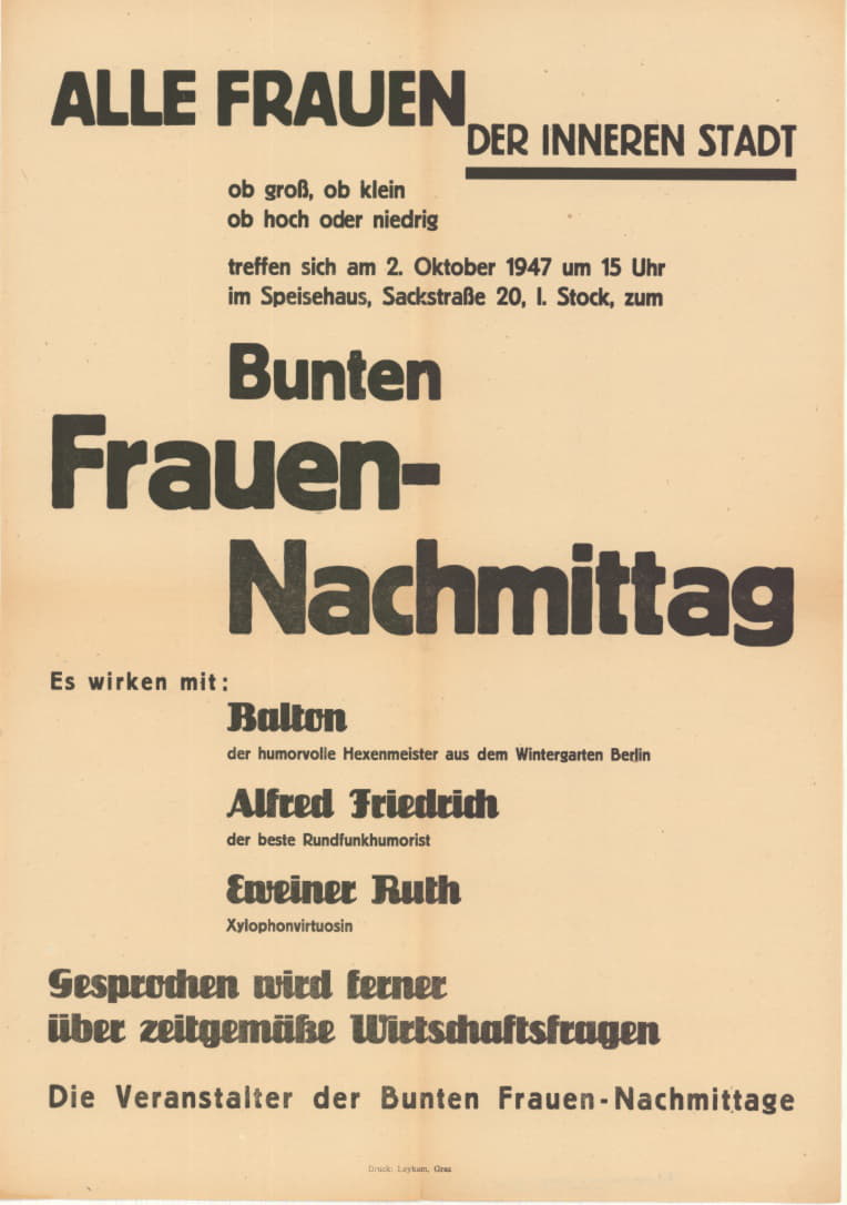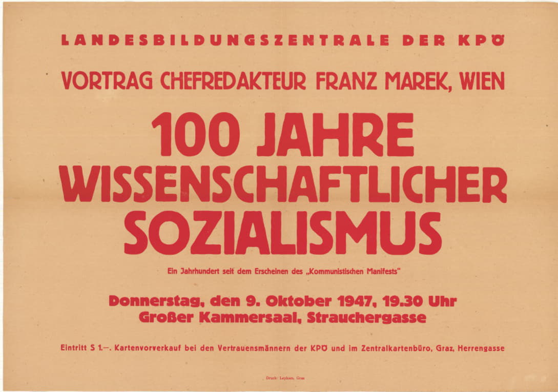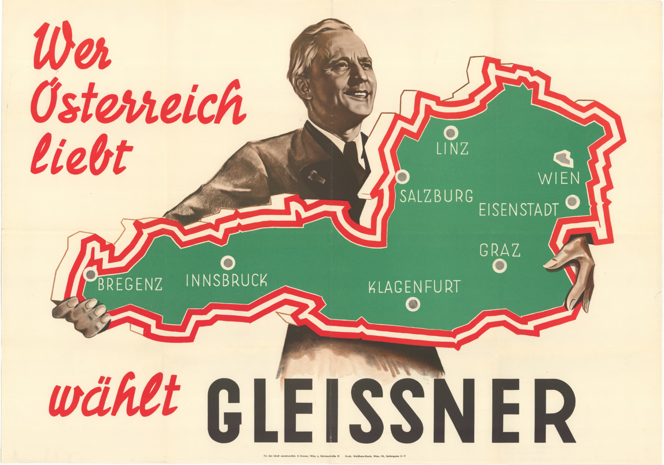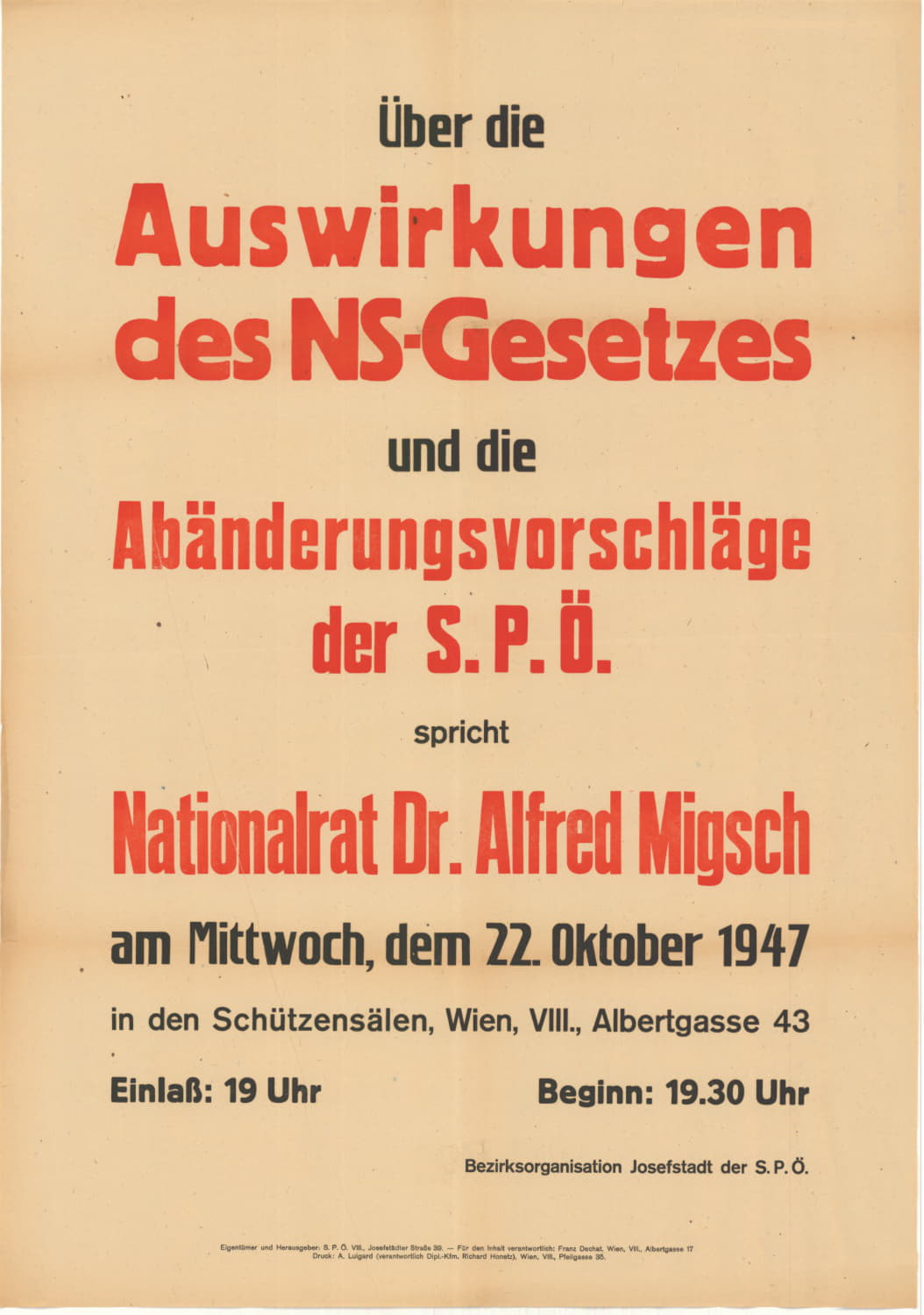 Text:"Die drei demokratischen Parteien rufen Euch Bewohner des 14.Bezirkes, zu der am Samstag, 30. Juni 1945, stattfindenden Massenversammlung in das Baumgartner Kino (...) Es sprechen Redner und KZ-Häftlinge aller drei Parteien ...