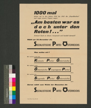 Text:"1000 Mal hörten wir in den Jahren 1938 bis 1945 die "Unpolitischen" und sogar unsere Gegner sagen:"Am besten war es doch unter den Roten!..."Erinnert Euch an diesen Ausspruch und handelt darnach!Wählt am 25. No...