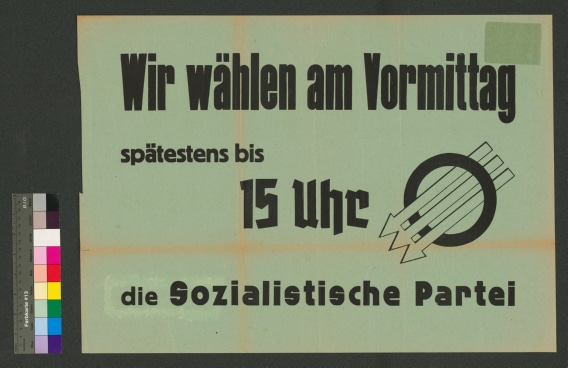 Text:"Wir wählen am Vormittag spätestens bis 15 Uhr die Sozialistische Partei"Bild: SPÖ-Logo mit Drei Pfeilen und Kreis.Grün, schwarze Schrift